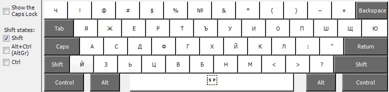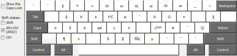 Натиснати Alt + Ctrl Испански , Руски малки , Гръцки букви и необходими символи.