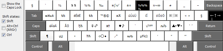Натиснати Ctrl + Shift Сръбски , Скандинавски ,Немски ,Старобългарски букви , различни математически символи и знаци за украса .